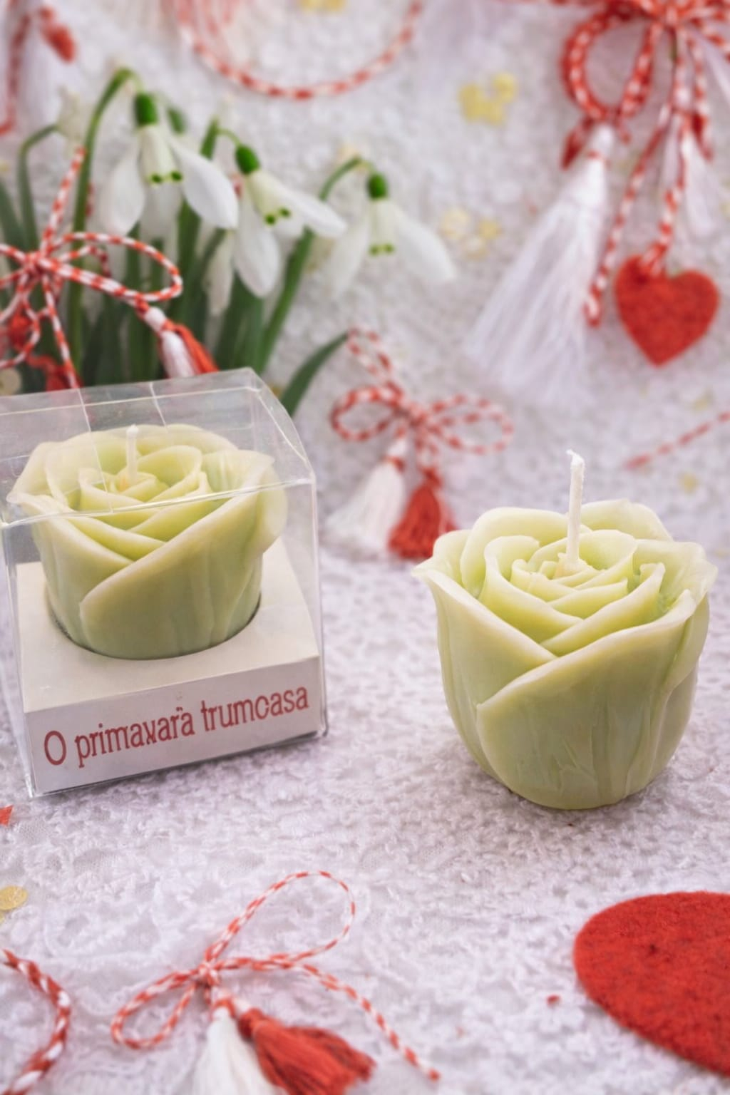 Această lumânare decorativă tip mărțișor, realizată manual din ceară naturală de soia, are forma unui trandafiir delicat, în nuanță verde deschis – simbol al prospețimii, speranței și unui nou început. Ambalată elegant și accesorizată cu șnur tradițional alb-roșu, lumânarea este un cadou inspirat pentru 1 Martie, oferind un mesaj de primăvară autentic și rafinat.