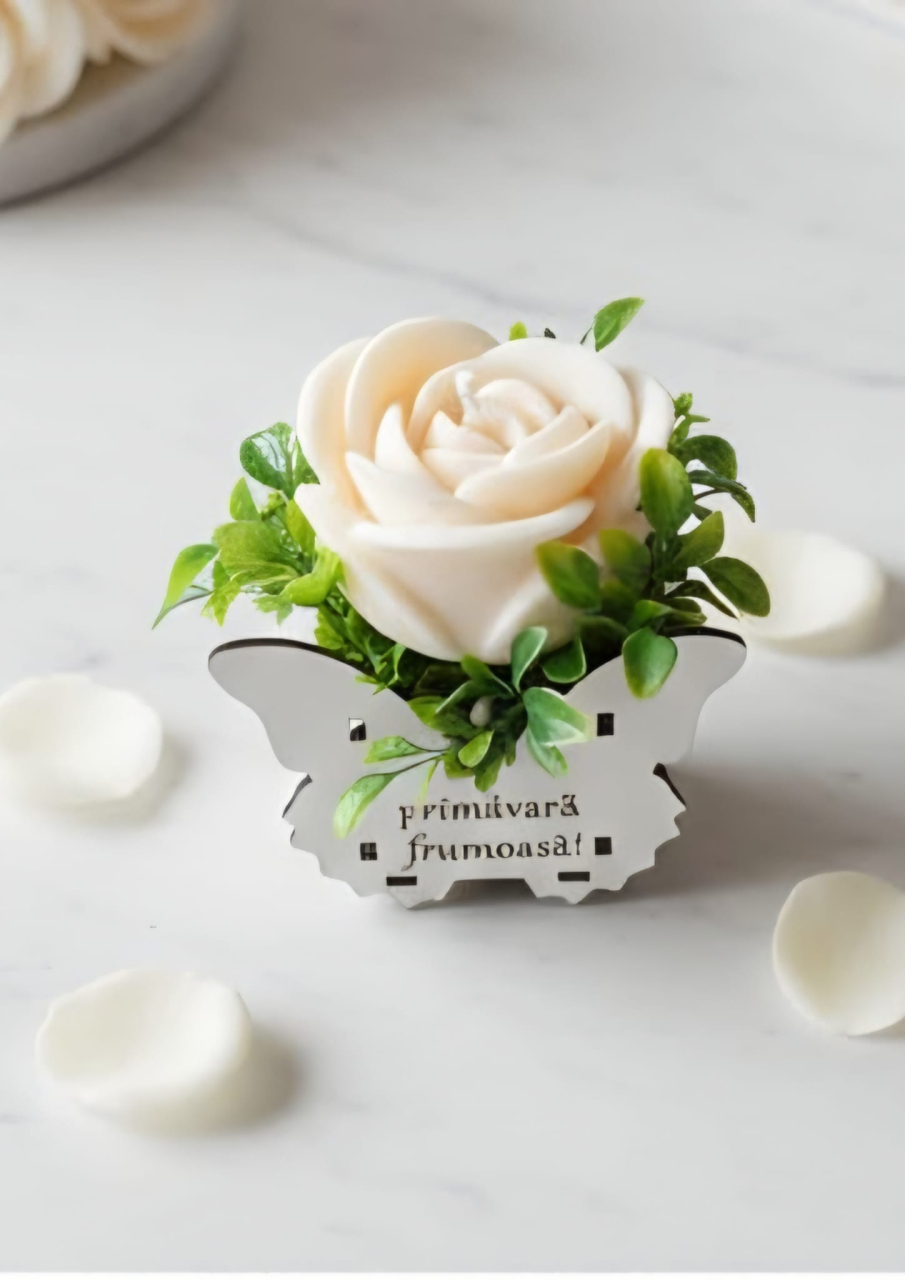 Lumânare decorativă în formă de trandafir, realizată manual din ceară de soia parfumată, așezată într-un elegant coșuleț decorativ în formă de fluture, cu mesajul „O primăvară frumoasă”.