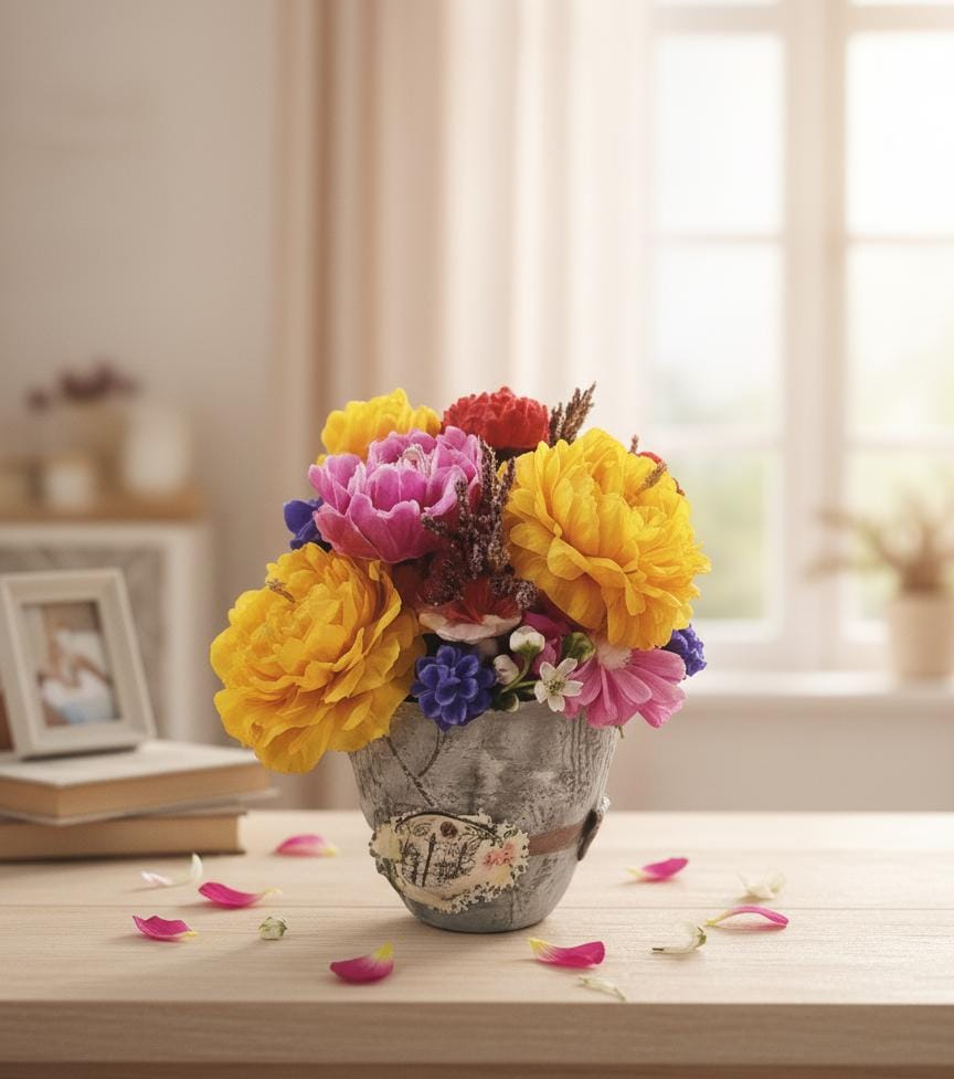 Un strop de vară în fiecare detaliu – „Summer Glow” este un aranjament vibrant, realizat manual din flori galbene și roșii din ceară de soia 100% naturală. Culorile calde și vii evocă energia verii, în timp ce delicatețea florilor sculptate adaugă rafinament și prospețime oricărui spațiu. Fără parfum, vegan și non-toxice, aceste flori sunt alegerea ideală pentru un decor sustenabil și original sau un cadou de impact.